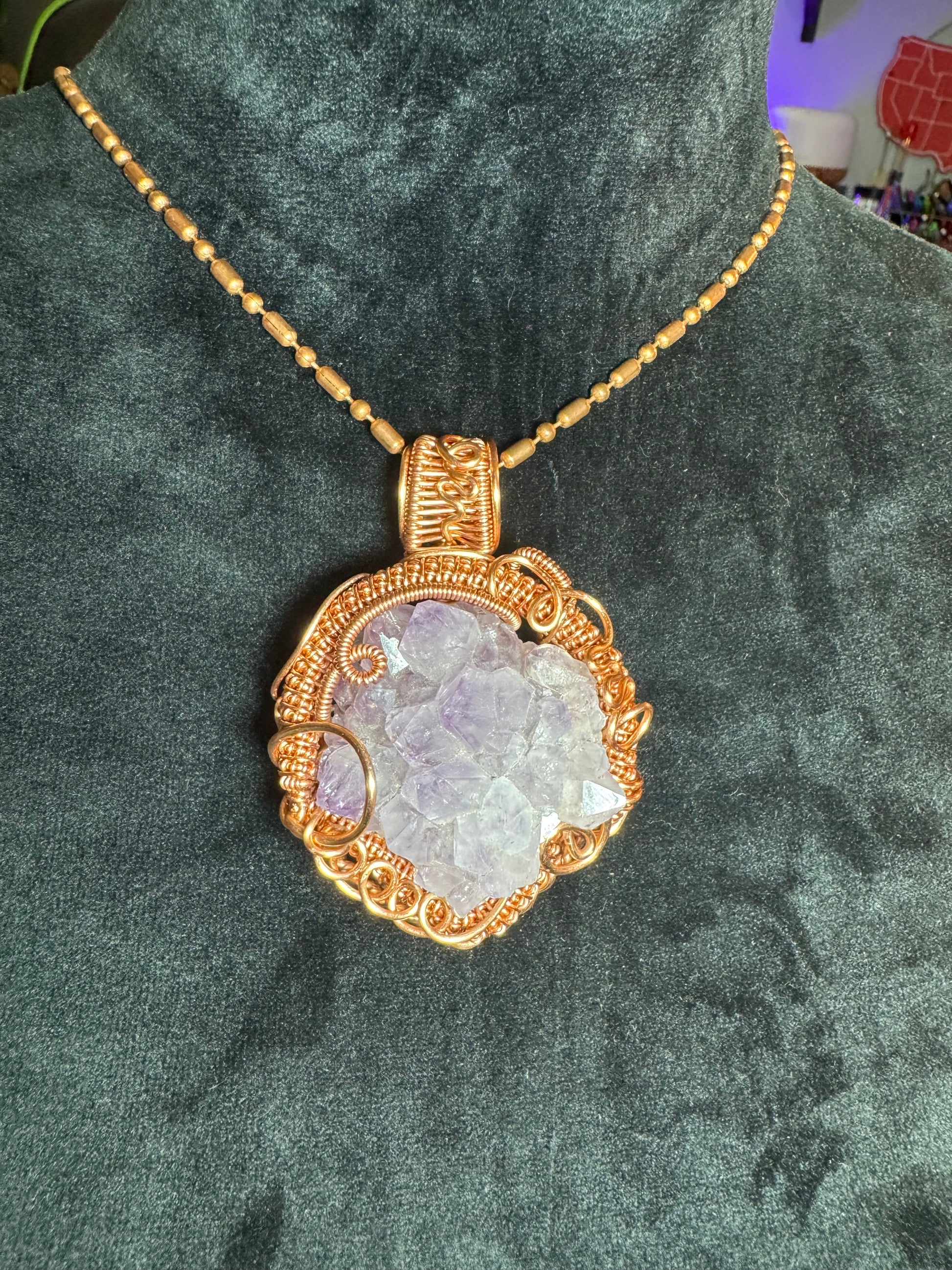 Gorgeous weighted Amethyst pendant. The Amethyst is natural and has some weight to it. The crystal is wrapped in tarnish resistant copper when the copper chain is natural bare copper. The chain will tarnish over time.