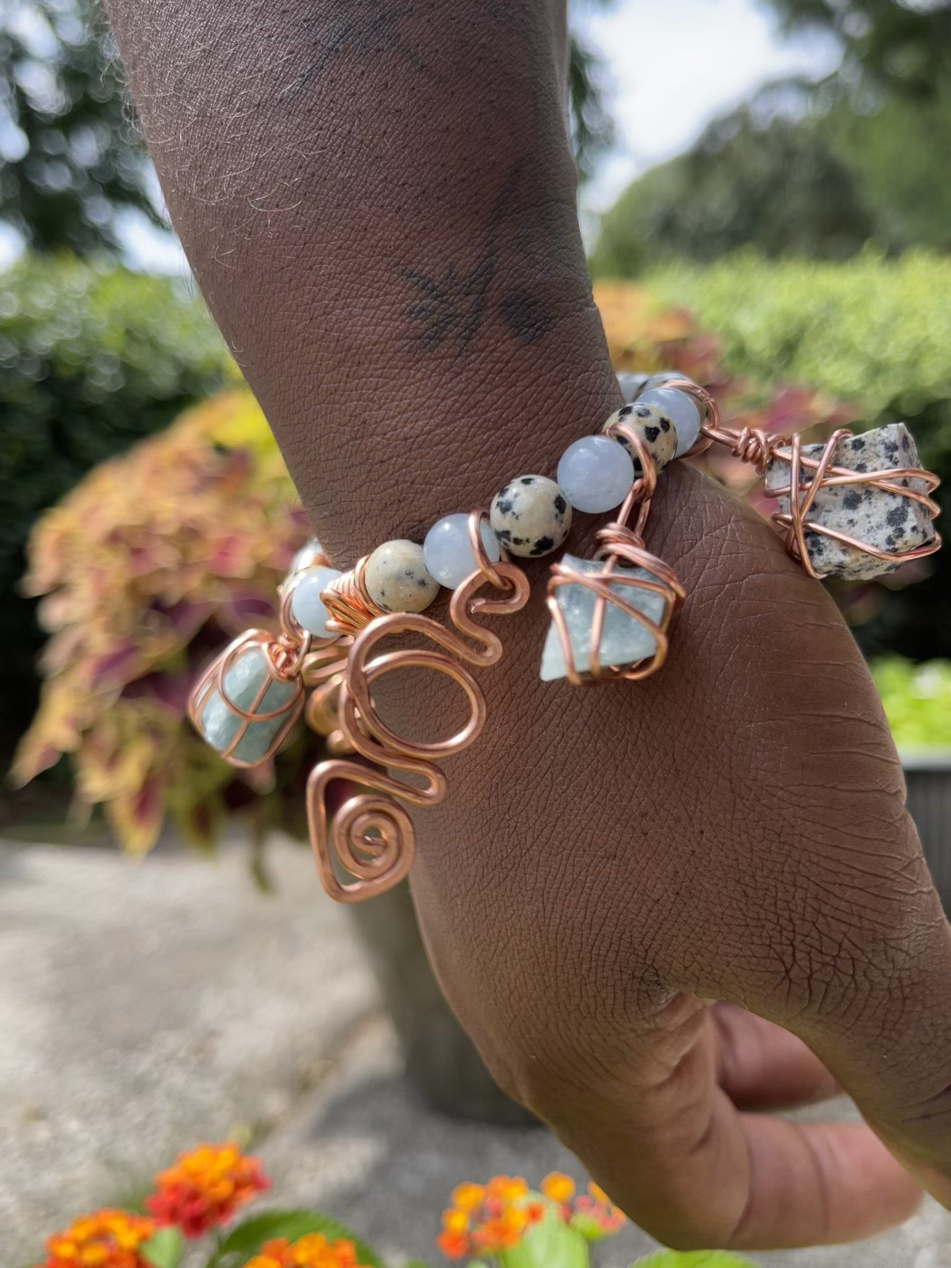 Elastic beaded Aquamarine and Dalmatian stone bracelet. Adorned with tarnish resistant handcrafted copper charms. Natural Aquamarine and Dalmatian stones also wrapped in tarnish-resistant copper.