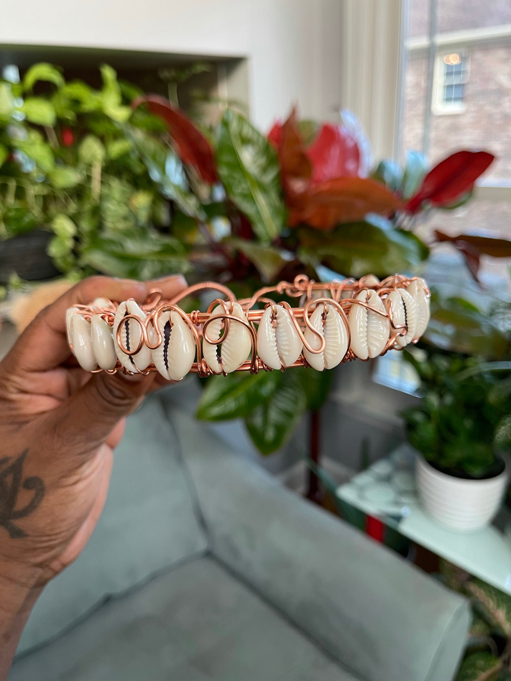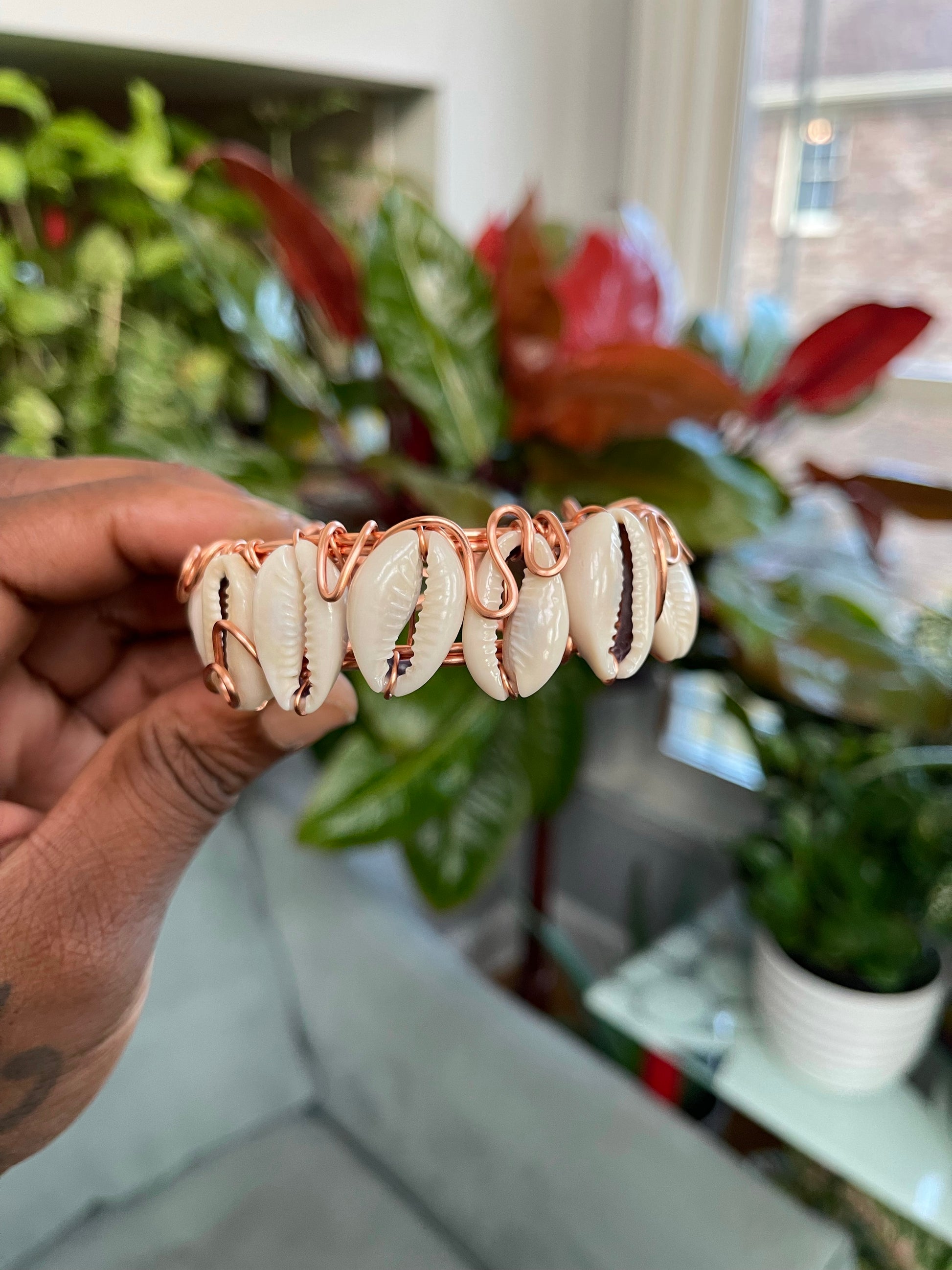 This alluring Cowrie Shell choker and cuff set are simply giving! The copper in this dry gives a more Royal and modernized look to the traditional cowrie jewelry. The copper used is also tarnish-resistant which means it won’t change colors as you wear it. Hair won’t disturb the quality! This set will arrive to a standard fit. Please notify after purchase if you’re for specific measurements.